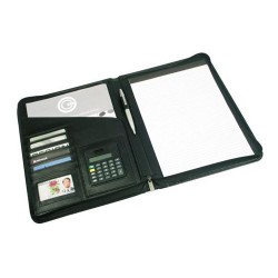 Black smooth PVC cover with grey trim. Features lined A4 notepad, pen loop, multiple business card holders and inside zippered pocket. Optional dual powered D980 calculator.