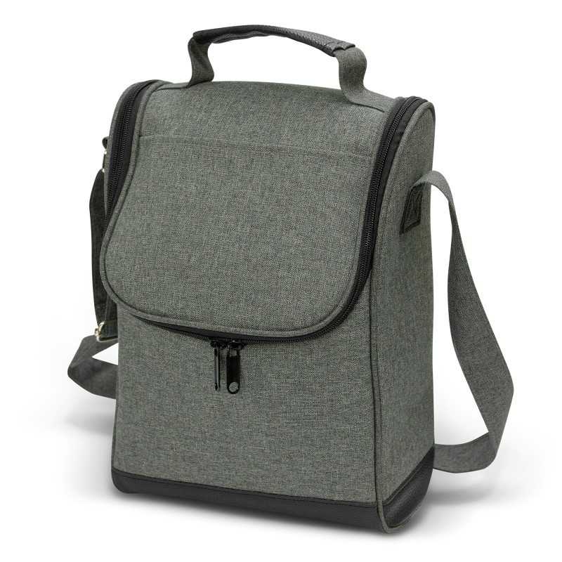 600D polyester, Fully insulated with aluminium PVC lining, Includes - 2 acrylic goblets, 2 cotton napkins, waiter's friend bottle opener & bottle stopper, Shoulder strap & carry handle, Can be adjusted to carry 2 bottles, Metal badge, Wine not included.