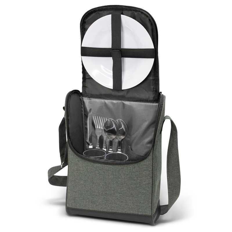 600D polyester 4 person setting (4 Spoons/Knives/Forks/Plastic Wine Glasses/Cotton Napkins, 2 Salt & Pepper Shakers, 1 Cutting Board, 1 Cheese Knife, 1 Bottle Opener) with 15 litre cooler compartment and detachable insulated wine cooler. Please note a standard digital transfer CMYK cannot be exactly PMS matched.