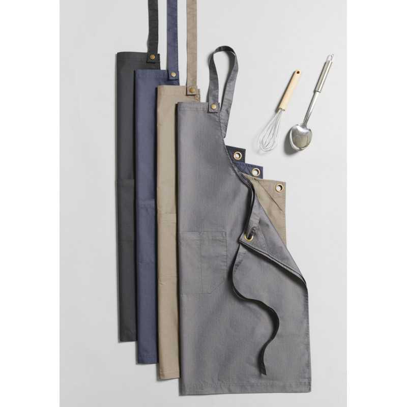 Fashion inspired 280gsm cotton bib apron with a medium pocket on the front and gunmetal rivets. It has interchangeable coloured cotton straps which cross over at the back for an adjustable fit. The straps feature a gunmetal dome for easy removal of straps.