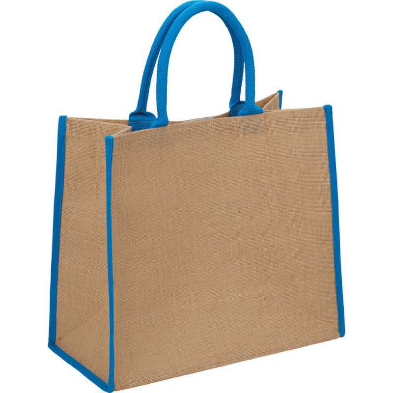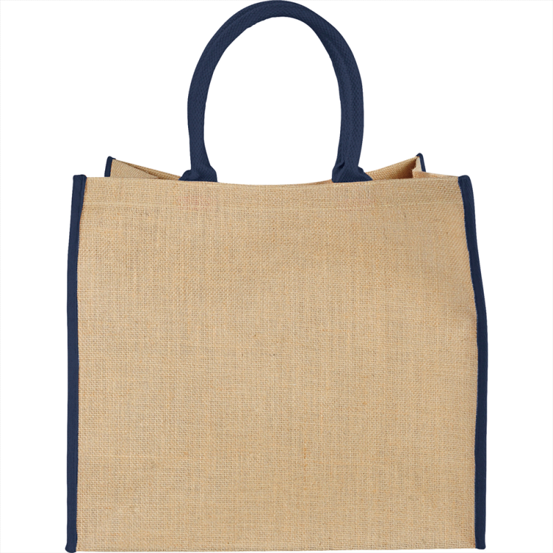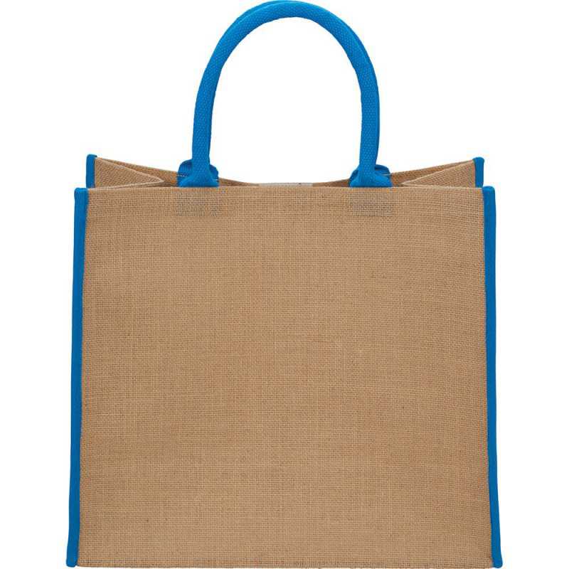 Classic laminated jute tote bag with a large gusset and padded cotton handles. The bag and handles have been dyed to match.