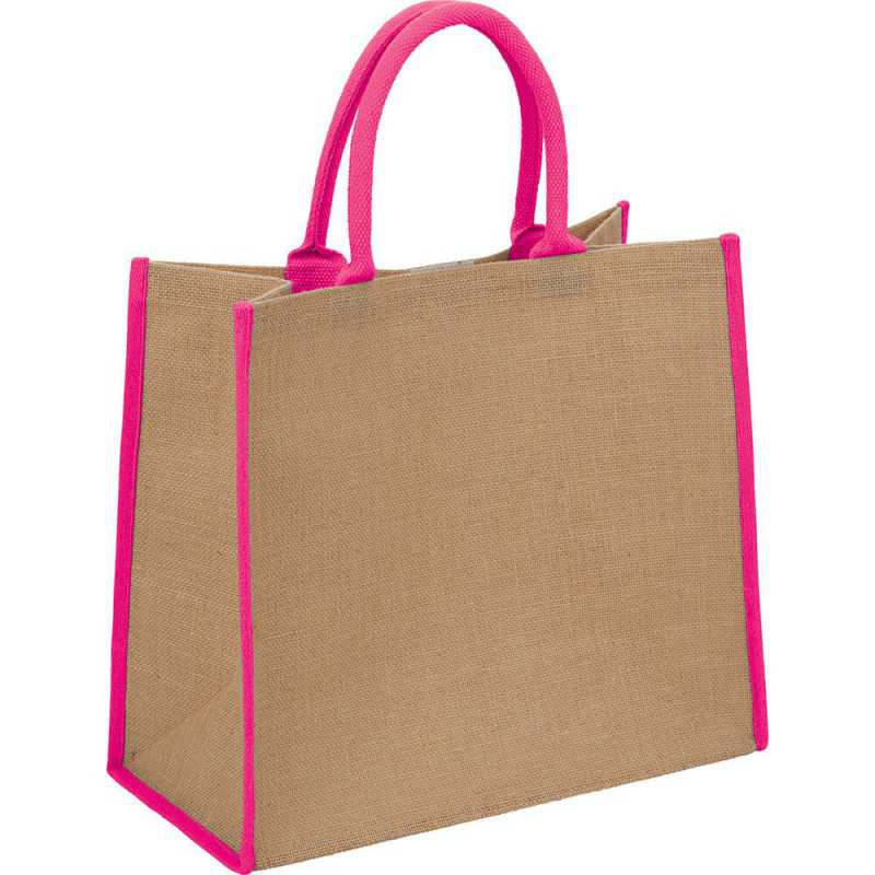 Extra-large laminated jute tote bag with a gusset and padded cotton handles. It is available in four colours where the gussets and handles are dyed to match.