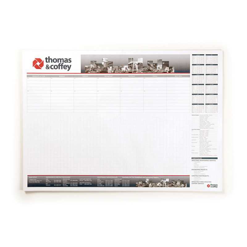 Desk planner pad with 50 leaves of quality 70gsm paper and a cardboard back. It is printed using four colour process which gives the option of unlimited spot colours or stunning full colour at no extra cost. PMS colour matches are only approximate. Edge-to-edge printing is available and a production lead time of 20 working days applies to this product....
