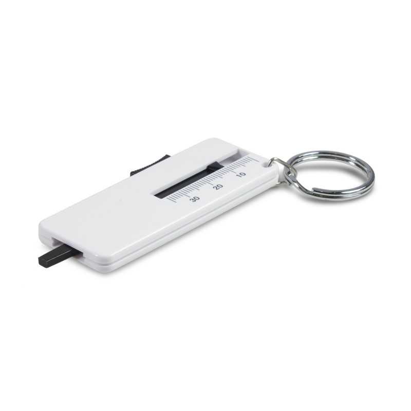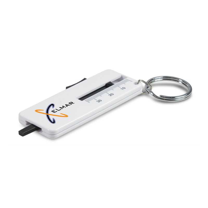 A novel 2 metre tape measure with push-button stopper. Includes Metric/Imperial measurements and keyring attachment.