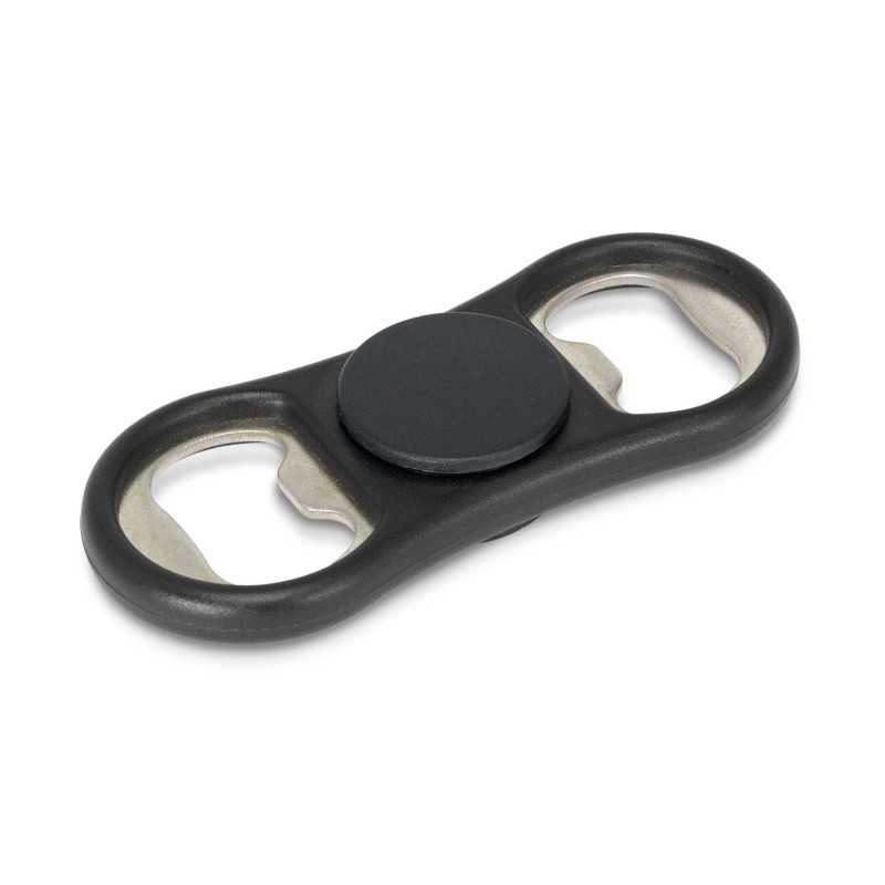 Spinner bottle opener with dual nickel plated steel bottle openers. Steel bearings for fast spinning action. Centre is printed with your logo on one side of the bottle opener. ABS with nickel plated steel opener
