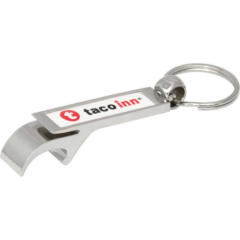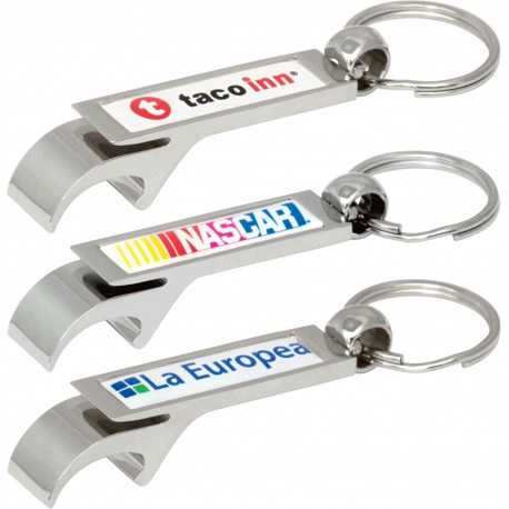 Stout is designed to open both bottles and cans with ease. Featuring a swivel keyring attachment and high gloss chrome finish. Your logo is printed in full colour and protected by a clear UV resistant dome.