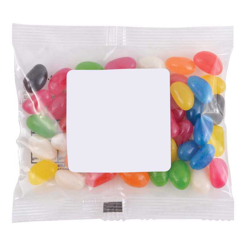 Silver Zip Lock Bag Filled With Jelly Beans 50G ingredient info: On Each Item Packaging: Confectionery Placed Directly into Silver Zip Lock Bag
