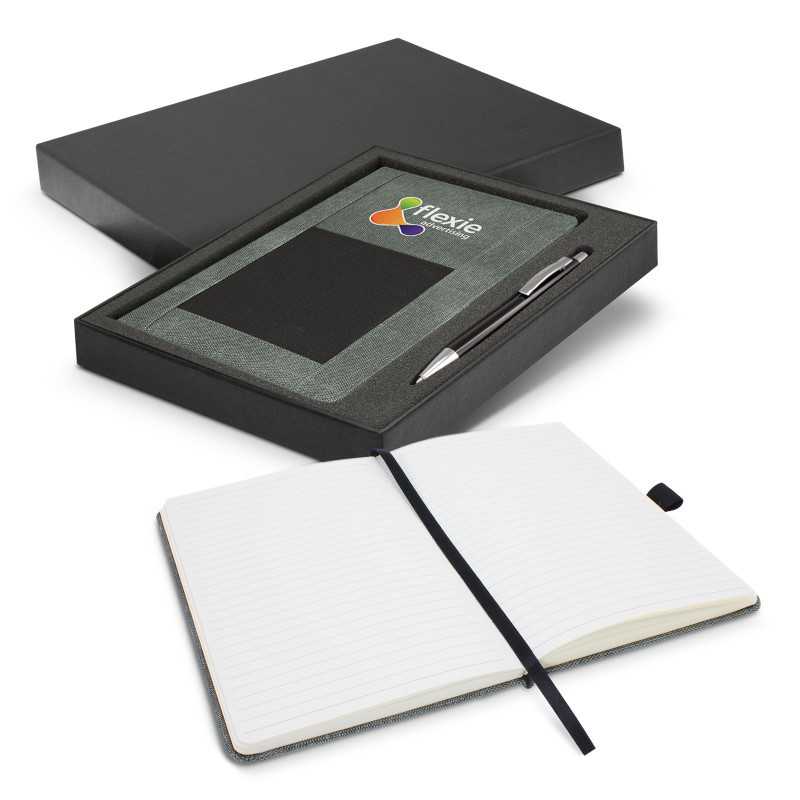 Oslo A5 Notebook is so much more than just a notebook. It’s designed to free your hands while you’re out and about by providing a secure place to hold your mobile phone, pen, business cards and much more. Crafted from the latest fabric inspired materials and available in grey, navy or black. Optional gift box available, see W17. If youre after a debossed...