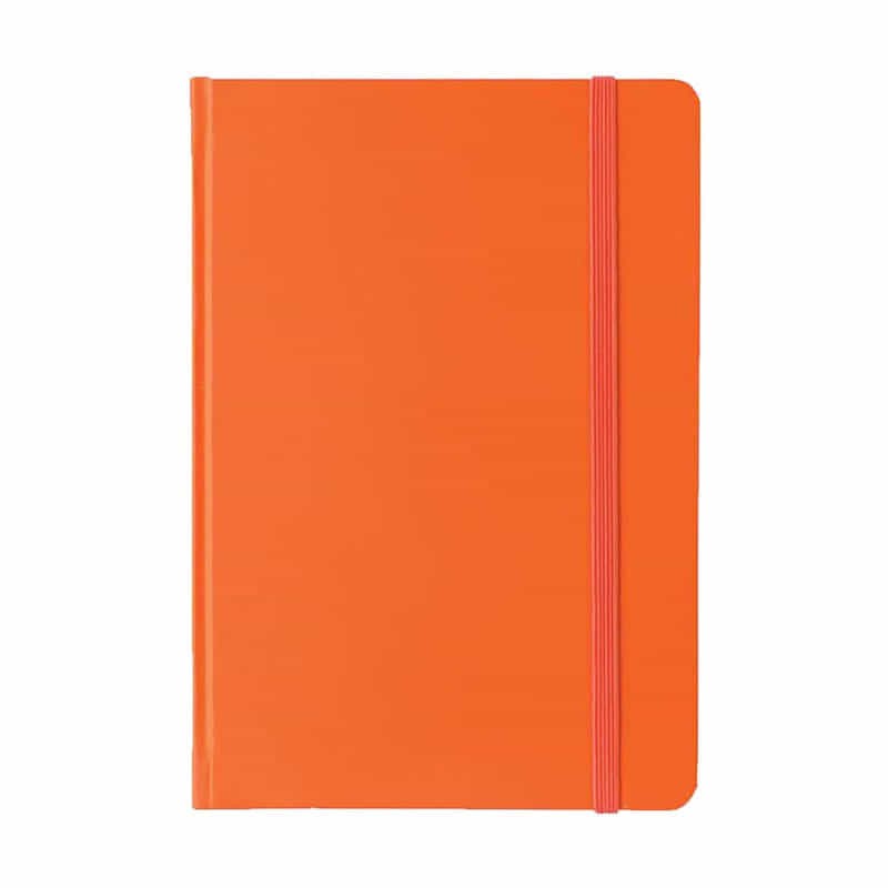 PU A5 Notebook with pen holder in spine, elastic retaining closure and ribbon page maker. 96 leaves, 192 lined cream pages (70GSM). Coloured corner accent feature. PU Cover, Cardboard & Paper
