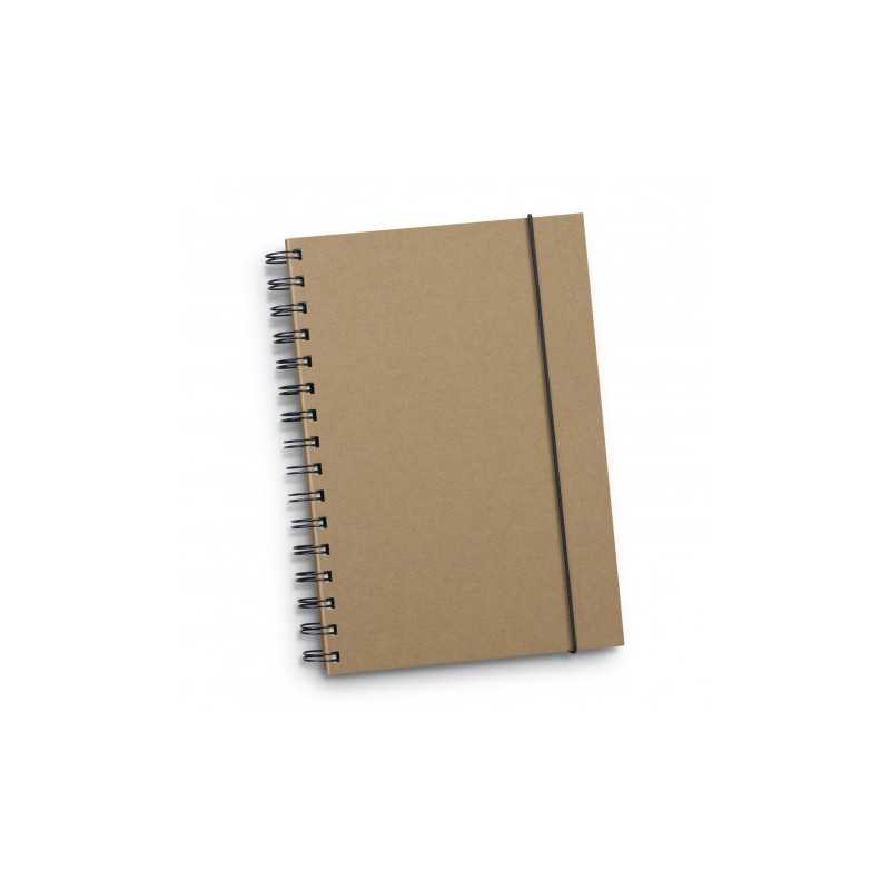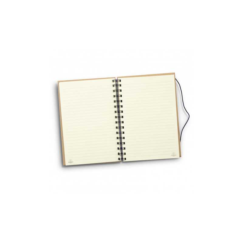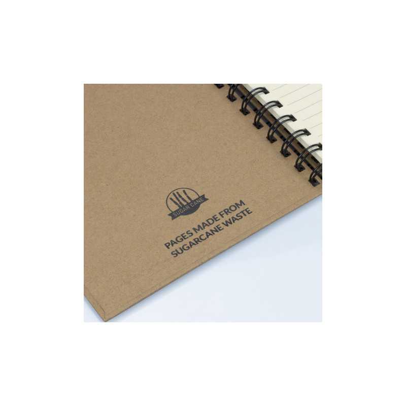 Unbleached cardboard cover (600gsm) spiral bound notebook with Matador Eco Pen. 70 sheets, 140 lined cream pages (70gsm). Eco Credentials. Renewable. Recyclable. Printed using reusable energy.