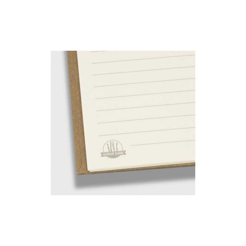 Natural cover A5 notebook with neutral colour elastic strap, pen loop and page marker. 80 leaves, 160 lined white pages (70GSM). Eco Credentials. Renewable. Recyclable. Biodegradable. Printed using reusable energy.