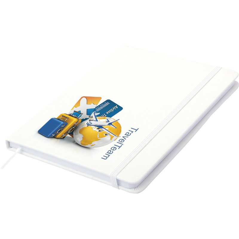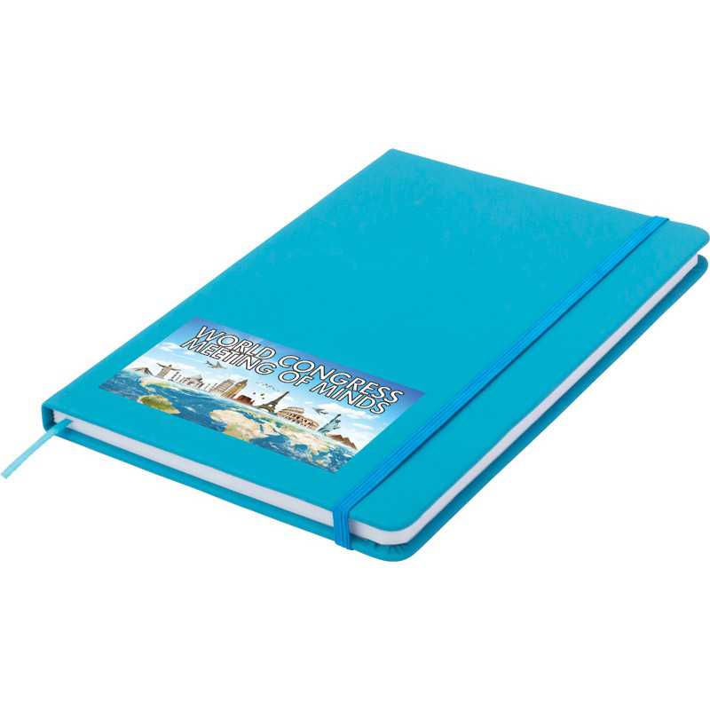 These stylish A5 notebooks are guaranteed to receive attention. Featuring a natural coloured Bonded Leather hard cover with edge stitching, 9mm wide natural coloured elastic closure, pen loop, marker ribbon and 192 pages of high quality cream paper. Notebook Gift Box is optional extra - see W17. LOGO TAG OPTION: Our latest decorating technique for this...