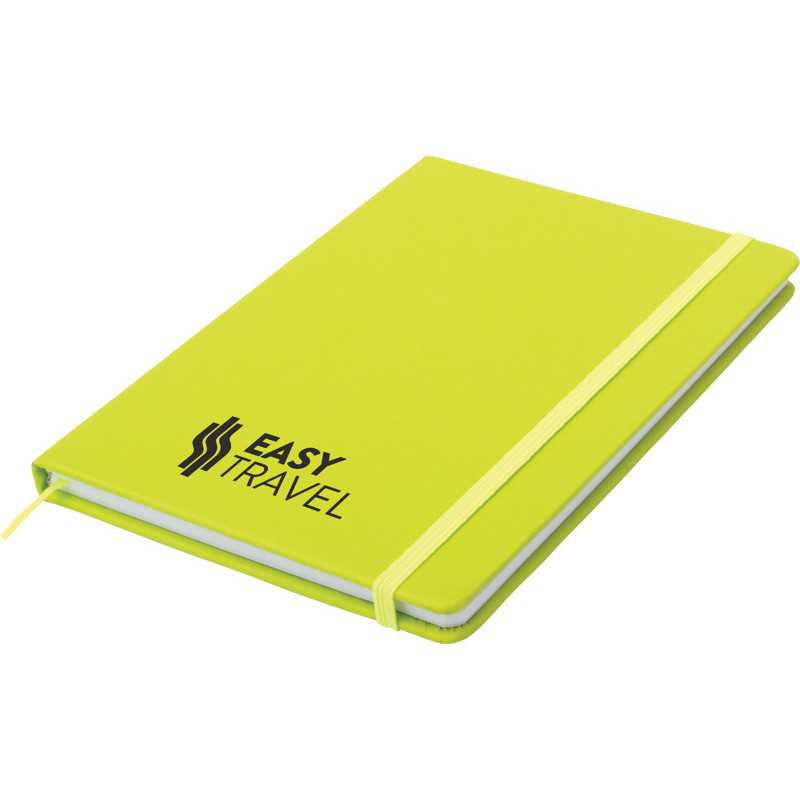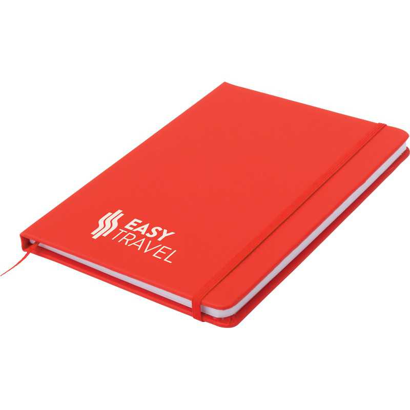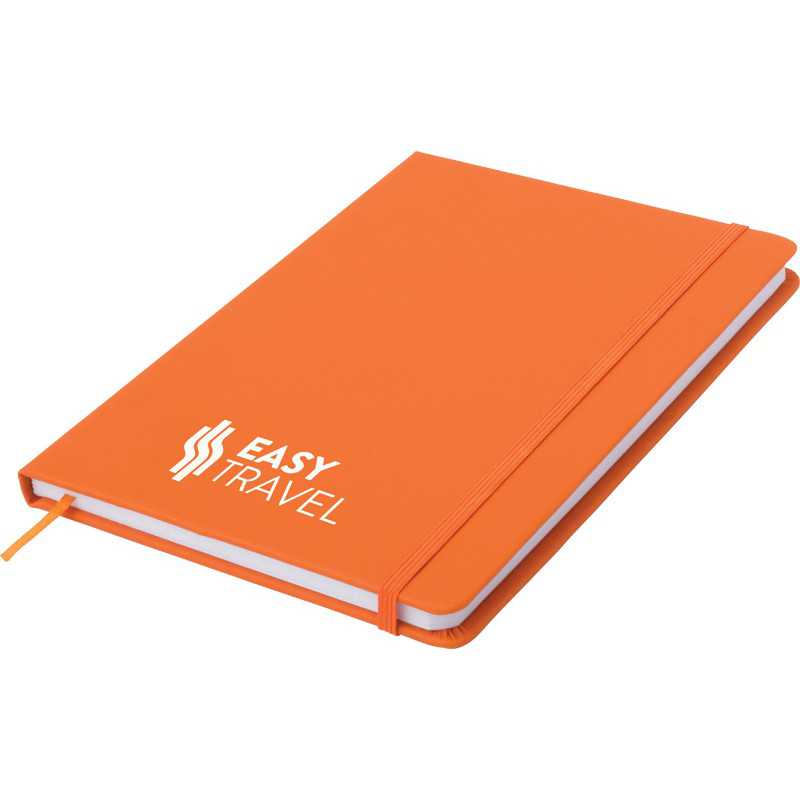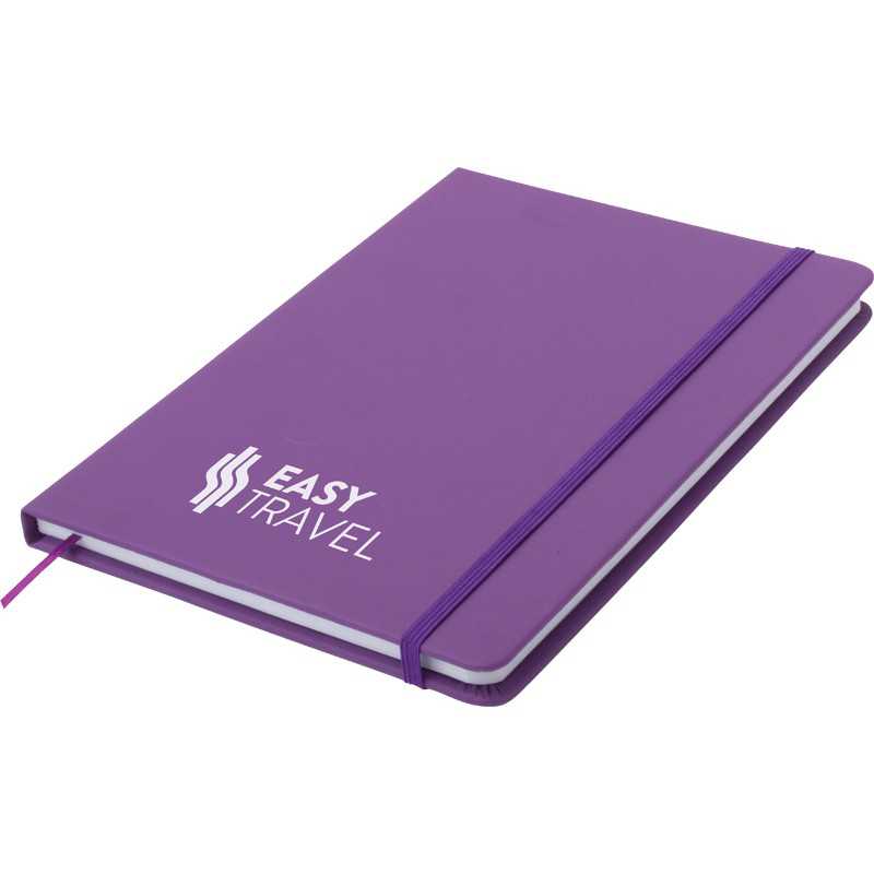 PU A5 Notebook with pen holder in spine, elastic retaining closure and ribbon page maker. 96 leaves, 192 lined cream pages (70GSM). Coloured corner accent feature. PU Cover, Cardboard & Paper