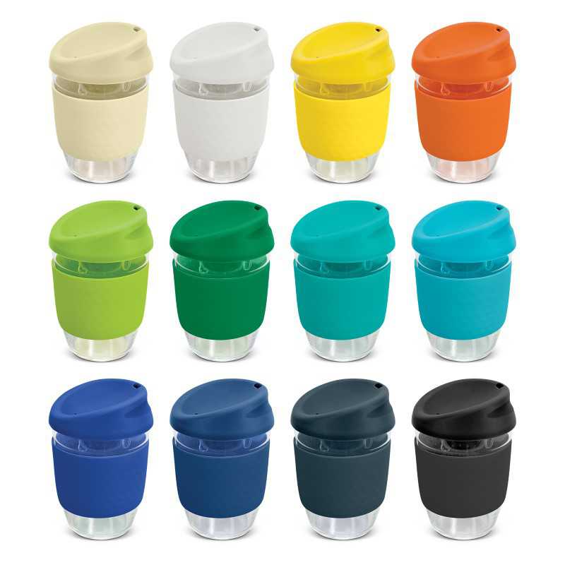 Fashion inspired 340ml reusable glass coffee cup with a secure push on silicone lid and a wide heat-resistant silicone band. The lid and band can be mixed and matched in any colour combination from the standard colours at no extra cost. Up to five different colour combinations are included in the price and more are available for an additional charge....