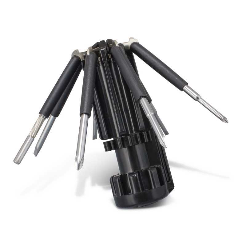 Smart seven-piece set of powder coated tools in a compact, pocket-size multi-tool. It has five different size Allen keys, a Phillips screwdriver and a conventional screwdriver.