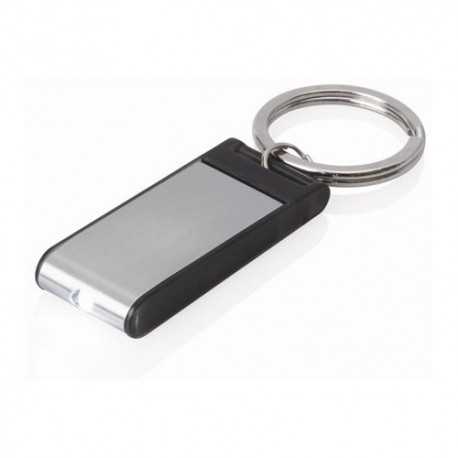Rectangular flashlight keytag with LED White light. Push button on back. Button cell batteries included. Silver panel and split ring with coloured trim. This item contains button cell batteries*. ABS