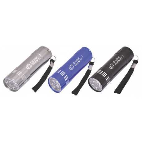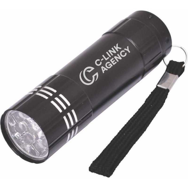 Aluminium flashlight. Includes black hand loop. 9 powerful white LEDs. Supplied in black 2 piece gift box.