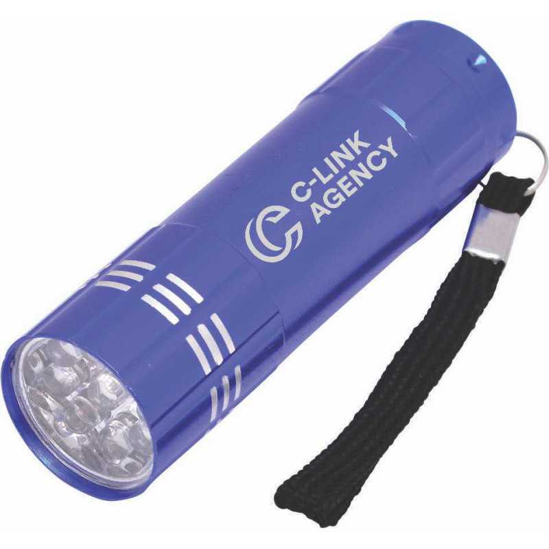 Compact torch with nine powerful LEDs and a woven strap. It is powered by three AAA batteries which are included.