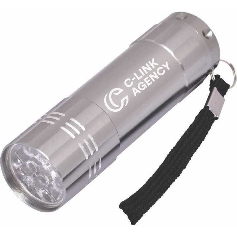 Premium aluminium torch with nine powerful LEDs. It has a wrist strap and uses three AAA batteries which are included. Solaris laser engraves to an oxidised white colour.