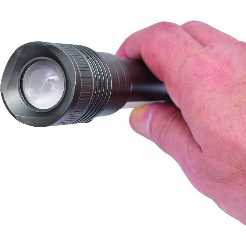 3 Watt black metal torch with bright LED and an push and pull action adjustable beam setting. Presented in a black gift box which can also be printed on.