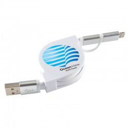 Retractable USB cable with micro USB and 8 Pin connector cable. Will sync and charge devices via USB port. 1 metre long when extended and will carry 2.1 Amps. Factory instructions printed under dome on 1 side. ABS body, TPI Cable outer