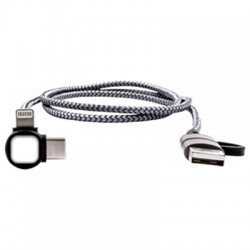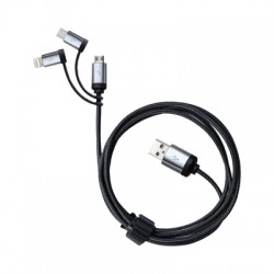The Pesaro 3n1 charge cable is manufactured using high grade 24 AWG copper wire, a braided fabric exterior and plated connector heads. Suitable for mobile devices this cable provides you with USB to Micro USB, 8Pin (lightening) and Type-C connectivity to charge your device or transfer data at high speed. Material: Plated ABS, Braided Nylon....
