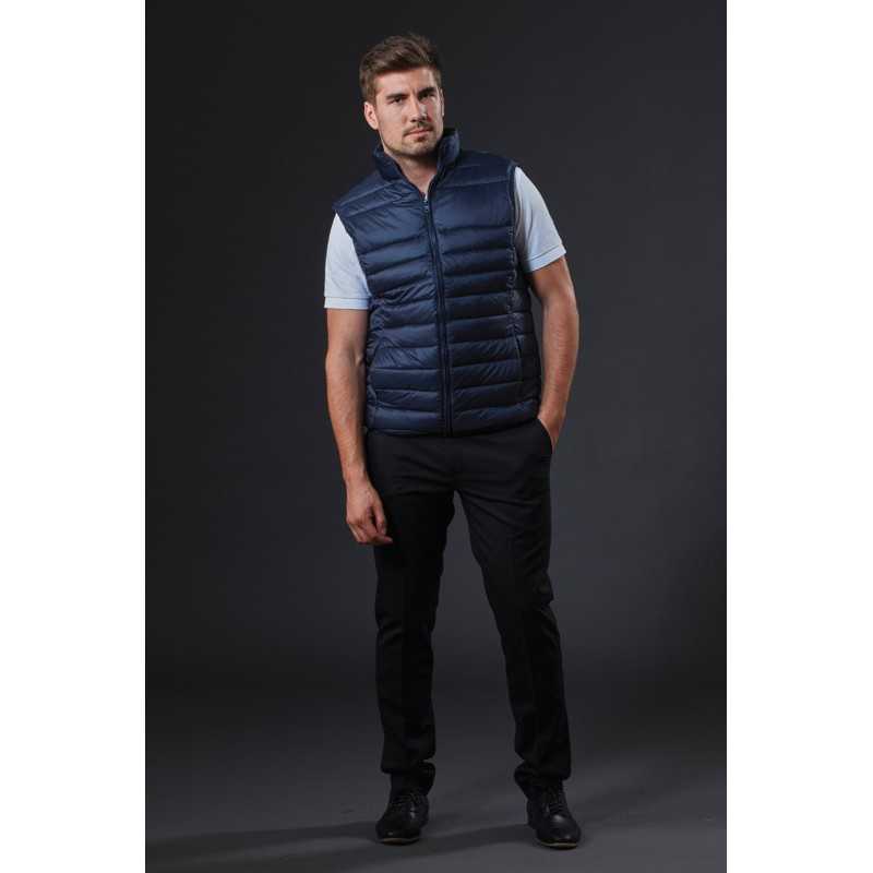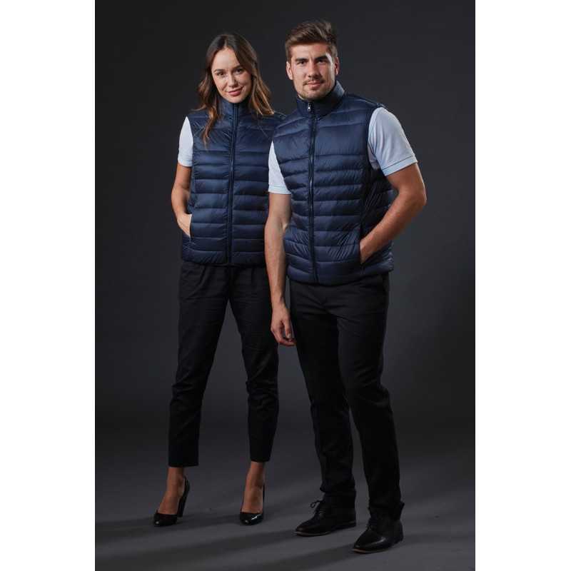 Water repellent unisex padded vest with water proof zippers, elastic drawstring at bottom hem and top of collar. Fleece in pockets and inside collar. Two zipped inner pockets, one with cord opening. The yoke can be opened for ease of decoration. Fleece in pockets and inside collar.|Two zipped inner pockets, one with cord opening.|The yoke can be opened...