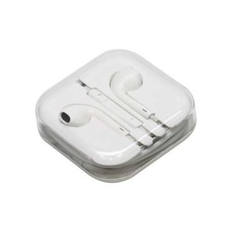 Set of earbuds in a convenient pocket-size plastic carry case. Branding is on the carry case.